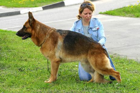 3 х Чемпион РКФ, Чемпион ОАНКОО, 2 х CACIB, 4 х RCACIB Дата рождения: 28 мая 2003 года Отец: Xadro v.Bad-Boll Мать: ANGIE di Casa di Sandra Окрас: Черно-рыжий Описание: Среднего роста, достаточно пигментирован, желательно больше черного на верхней части головы, высокая холка, очень хорошие линии верха и низа, не прочны связки спины, хорошие углы передних, подчеркнуты углы задних конечностей, прямой фронт, корректный постав ушей, темные глаза, прямая поступь, плавный ход, был представлен несколько тяжеловатым.